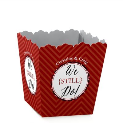 Love the very subtle use of red at these party tables, a small red ribbon with a flower at each place setting and on the favor boxes. Plus delicate red flowers scattered on the table.