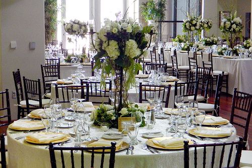 Adding big blocks of color to your tables is easy with flowers and you could increase the impact by having a table runner or charger plates in the anniversary color as well.