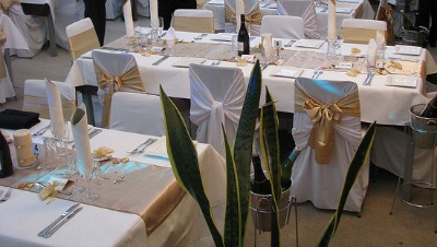 Your anniversary favors can also be an important part of your room's decorations. This room is simply decorated in gold and you can see the gold favor bags adding an extra touch of color to the tables.
